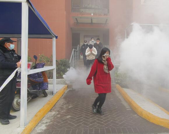 活動第一環(huán)節(jié)為居民應急疏散演練。演練模擬在燕舞園小區(qū)居民樓內(nèi)發(fā)生火災,現(xiàn)場濃煙滾滾。街道應急管理部門接報后立即啟動《邁皋橋街道突發(fā)事件應急預案》和《邁皋橋街道突發(fā)環(huán)境事件應急預案》,成立現(xiàn)場指揮部。演練過程中,在現(xiàn)場指揮部的指令下,疏導人員、救助傷員、現(xiàn)場處置、環(huán)境監(jiān)測等所有處置工作有條不紊地進行著。經(jīng)過20分鐘戰(zhàn)斗,事故得到有效處置,周邊環(huán)境符合相關(guān)標準,達到了預期演練效果。