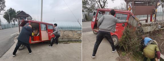 村民使出渾身解數(shù),想要憑一人之力把三輪車“解救”出來,但無奈三輪車紋絲不動。正值焦頭爛額之際,社區(qū)工作人員正好路過,看到村民的情況,立馬施以援手。大家一起討論方案,商量對策,決定在輪胎底部墊上木板用以借力,再將三輪車抬出來。此時(shí),路過的兩位村民也過來幫忙,大家齊心協(xié)力往一處使力,不一會兒,三輪車就被拖回了馬路邊。