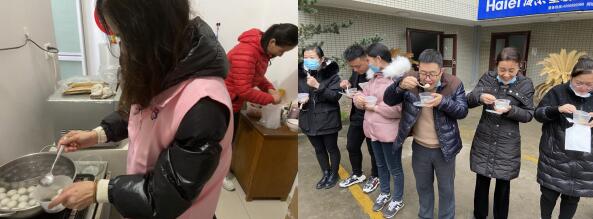 為了讓留寧員工能過(guò)一個(gè)圓圓滿滿的元宵節(jié),社區(qū)婦聯(lián)工作人員與谷里工業(yè)園一家專門生產(chǎn)口罩的嘉威醫(yī)療器械公司取得聯(lián)系,了解到今年春節(jié)他們員工為了響應(yīng)政府號(hào)召,幾乎沒有回家過(guò)年的。為了表示對(duì)他們的關(guān)心,在元宵節(jié)來(lái)臨之際,巾幗志愿者們?cè)缭鐏?lái)到社區(qū)煮起象征合家團(tuán)圓的糯米湯圓。熱騰騰的湯圓煮好后,巾幗志愿者們將寄托濃濃"愛心"的湯圓送到他們的手上,小小的湯圓里凝聚著對(duì)他們滿滿的祝福。并用特色的民俗表演—跑旱船,來(lái)表達(dá)對(duì)于留寧過(guò)年人員的感謝和敬意,員工們一遍吃著湯圓一遍觀看演出,臉上露出了幸福的微笑。