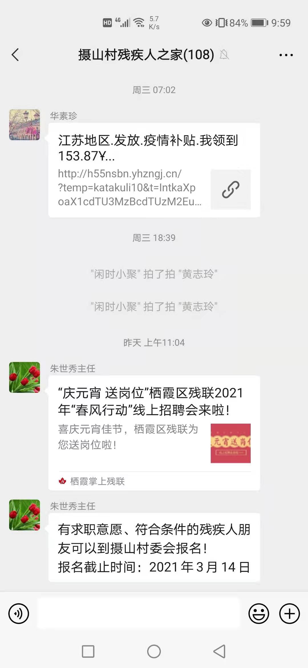 平日里,攝山村殘協(xié)對(duì)轄區(qū)內(nèi)的未就業(yè)殘疾人就業(yè)狀況進(jìn)行日常調(diào)查摸底,確保較全面地掌握村內(nèi)殘疾人員的就業(yè)動(dòng)向,利于日后幫扶工作的開展。開年以來(lái),不少企業(yè)開展招聘,針對(duì)殘疾人提供眾多的就業(yè)崗位。村殘協(xié)充分利用信息化手段,創(chuàng)新就業(yè)服務(wù)形式,在村殘疾人之家微信群中推送線上招聘信息,讓殘疾人求職者足不出戶就可以了解招聘信息、投遞簡(jiǎn)歷。