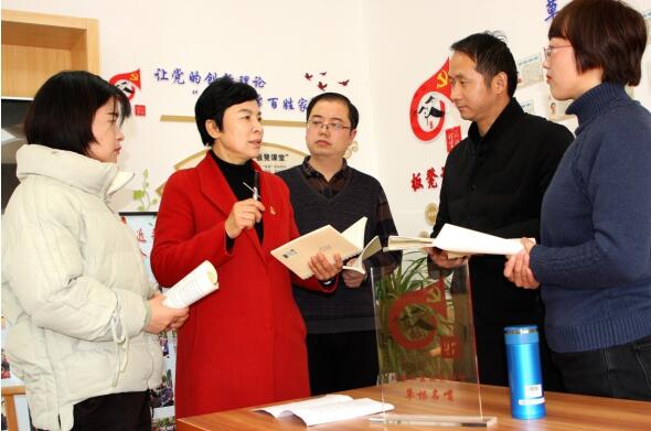 “板凳課堂”負(fù)責(zé)人徐修芳(圖左2)與志愿者老師商討“黨員冬訓(xùn)”學(xué)黨史課題計(jì)劃