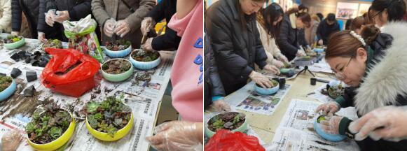 現(xiàn)場(chǎng),志愿者們帶來(lái)了許多不同品種的多肉,有錢(qián)串、兔耳朵、三角琉璃蓮等等。大家興趣盎然,在DIY環(huán)節(jié),大家躍躍欲試,紛紛手持小工具饒有趣味地種植起來(lái),一邊歡聲笑語(yǔ),一邊請(qǐng)教老師意見(jiàn),一會(huì)兒功夫,填土、配色、種植……一盆一盆有模有樣的多肉盆栽完工。“肉友”們抱著自己制作的盆栽開(kāi)心地對(duì)著相機(jī)擺起pose,并表示在這次活動(dòng)中體驗(yàn)了盆栽種植的樂(lè)趣、更感受到了很多綠色的正能量。