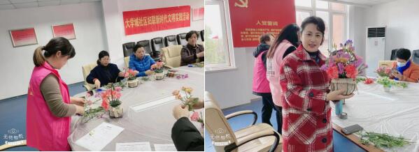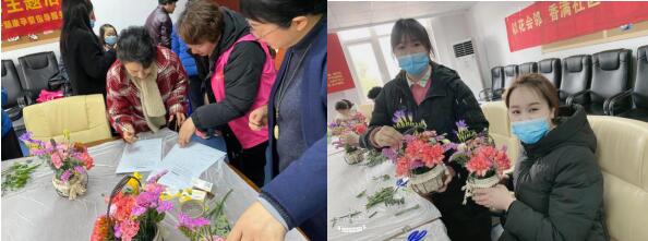 “桃之夭夭,灼灼其華,人面桃花相映紅,桃花依舊笑春風(fēng),這就是我們插花藝術(shù)……”經(jīng)驗(yàn)豐富的花藝?yán)蠋煬F(xiàn)場(chǎng)介紹鮮花常識(shí),從選擇與購(gòu)買(mǎi),到鮮花的保養(yǎng)與擺放,再到插花藝術(shù)的講解,在四溢的生機(jī)與浪漫中,在悠然的花香浸染間,享受閑適與自然。社區(qū)婦女們對(duì)插花藝術(shù)興趣極高,紛紛與花藝師交流互動(dòng),請(qǐng)教一些插花方面的專(zhuān)業(yè)知識(shí),并嘗試親手制作插花作品,與各種美美的鮮花來(lái)了次親密接觸。
