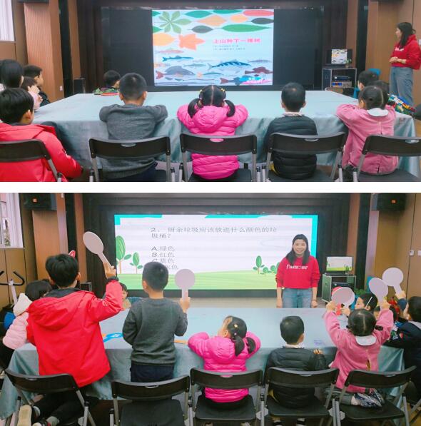 現(xiàn)場(chǎng),繪本閱讀老師和孩子們分享繪本《山上種下一棵樹》。這是一本嚴(yán)謹(jǐn)?shù)膬和L本,充滿了大量的知識(shí)點(diǎn),卻能用生動(dòng)的圖案和簡(jiǎn)潔的文字串聯(lián),看起來毫不吃力。老師用簡(jiǎn)潔流暢的敘述方式描述,從樹梢到土壤,從山巒到大海,多姿多彩的生態(tài),就從種下一棵樹開始……為孩子們編織了一個(gè)充滿生命力的自然循環(huán)之環(huán)。書的內(nèi)容很豐富,講了大自然的循環(huán),其實(shí)我們保護(hù)環(huán)境,環(huán)境會(huì)以某種方式回饋給我們?nèi)祟?。借此契機(jī)老師引導(dǎo)孩子們參加了一場(chǎng)別開生面的垃圾分類知識(shí)競(jìng)賽。隨著題目的播放,孩子們踴躍舉手,爭(zhēng)先恐后上臺(tái)回答問題,回答有誤的,現(xiàn)場(chǎng)耐心給予糾正,并告知錯(cuò)誤原因,加深記憶。