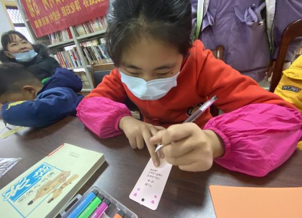 現(xiàn)場(chǎng),為了激發(fā)青少年參與活動(dòng)的積極性,還組織青少年們“DIY”書簽。裁剪紙條、勾勒框架,填充顏色......長(zhǎng)長(zhǎng)的紙條在青少年的創(chuàng)意繪制下組合成漂亮的書簽??粗约旱某善罚嗌倌陚兊哪樕下冻鰻N爛的笑容。
