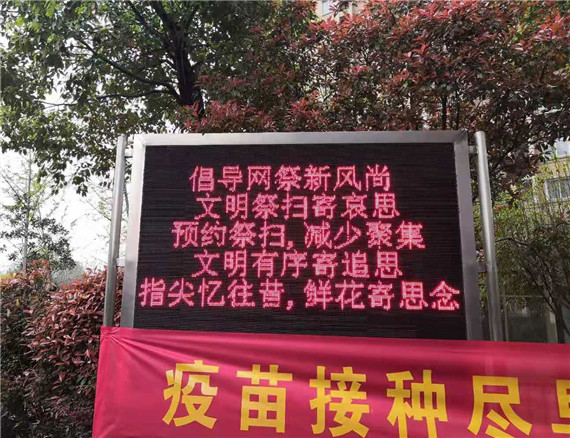 同時,通過宣傳電子屏、橫幅等形式,提倡鮮花祭掃、無煙祭掃、網(wǎng)絡(luò)寄托哀思等祭掃方式代替?zhèn)鹘y(tǒng)祭祀方式,引導居民積極踐行文明、節(jié)儉、低碳、環(huán)保的祭掃方式,使“清明”更加清明,讓思念常在,讓青山常在。