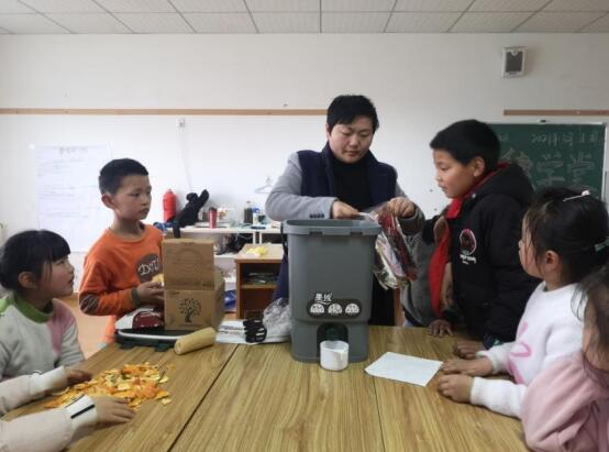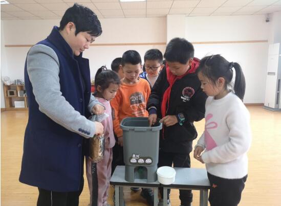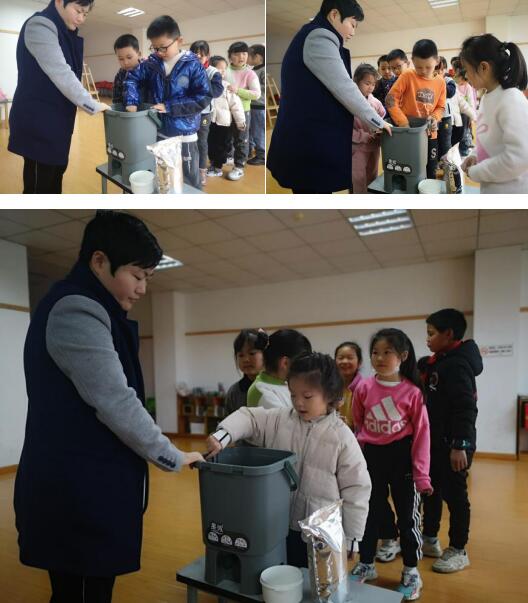 在老師的指導(dǎo)下,同學(xué)們將自己吃完的水果皮放進(jìn)堆肥箱中,加入菌種等待液肥的產(chǎn)生,期待在一個(gè)星期之后,可以為春天生長的植物們加點(diǎn)“餐”。