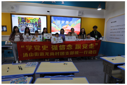 4月10日,湯山街道龍尚村團支部開展統(tǒng)一行動日活動,團市委副書記石磊、學(xué)少部、統(tǒng)戰(zhàn)部、團區(qū)委等一行18人參加,活動中走訪了困境青少年。江寧區(qū)湯山街道龍尚村邀請部分青聯(lián)委員在統(tǒng)一行動日走進圓夢教室,和小銀星藝術(shù)團的老師為圓夢教室參加此次繪畫展的孩子做藝術(shù)指導(dǎo),共繪“我和我的家鄉(xiāng)”畫作獻禮建黨百年。