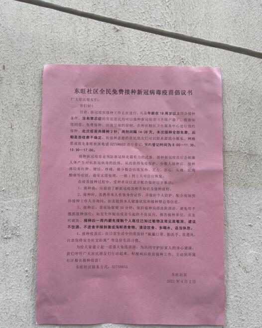 一是在東旺社區(qū)網(wǎng)格內(nèi)各處張貼新冠疫苗接種宣傳和相關(guān)通知;在宣傳欄張貼海報(bào),就接種人群要求、接種新冠疫苗應(yīng)注意的事項(xiàng)等進(jìn)行科普宣傳;網(wǎng)格員和村長一對一進(jìn)行入戶走訪,宣傳接種疫苗,及時(shí)做好村民疫苗接種登記預(yù)約,為居民提供更加人性化的特色便民服務(wù),全力保障接種點(diǎn)的接種工作順利進(jìn)行。