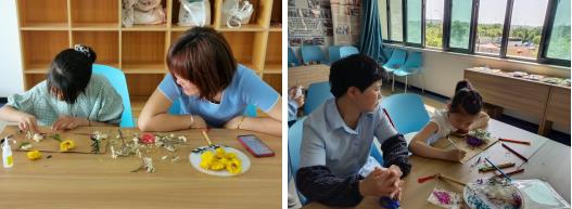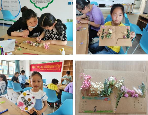 小朋友們發(fā)揮創(chuàng)意制作古風(fēng)四季團扇和卡片,寫下想和媽媽說的心里話,并送給媽媽。小朋友們安排著手中的干花材料,在團扇和卡片上先組合好,媽媽在一旁出謀劃策,協(xié)助小朋友們將干花粘在團扇和卡片上。