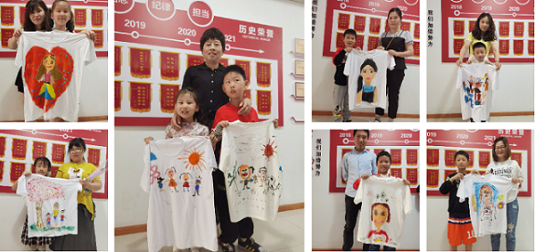 通過節(jié)日的祝福傳達(dá)對(duì)母親的感恩,是我們中華民族優(yōu)秀的傳統(tǒng)美德。社區(qū)工作人員和志愿者們?yōu)榍皝韰⒓踊顒?dòng)的家庭準(zhǔn)備了純白色的T恤,以及能用于衣服上作畫的丙烯顏料、顏料刷、調(diào)色盤等工具?,F(xiàn)場進(jìn)行的如火如荼,大家的白T恤上逐漸多了星星點(diǎn)點(diǎn)的色彩。親子溝通、親子默契、親子情感在繪畫過程中逐漸加強(qiáng)、升溫,快樂和幸福也在蔓延。在家長與孩子的通力合作下,一件件畫好的T恤“新鮮出爐”,衣服上的媽媽惟妙惟肖,孩子們都抓住了媽媽神態(tài)或者外貌上的特點(diǎn)。“畫得很像我,謝謝我的寶貝!”活動(dòng)現(xiàn)場的媽媽們綻開了笑顏。