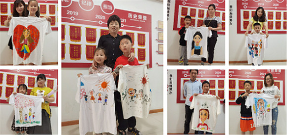 活動伊始,社區(qū)工作人員和志愿者們?yōu)榍皝韰⒓踊顒拥募彝?zhǔn)備了純白色的T恤,以及能用于衣服上作畫的丙烯顏料、顏料刷、調(diào)色盤等工具?,F(xiàn)場進行的如火如荼,大家的白T恤上逐漸多了星星點點的色彩。親子溝通、親子默契、親子情感在繪畫過程中逐漸加強、升溫,快樂和幸福也在蔓延。在家長與孩子的通力合作下,一件件畫好的T恤“新鮮出爐”,衣服上的媽媽惟妙惟肖,孩子們都抓住了爸爸媽媽神態(tài)或者外貌上的特點。“畫得很像我,謝謝我的寶貝!”活動現(xiàn)場的媽媽們綻開了笑顏。