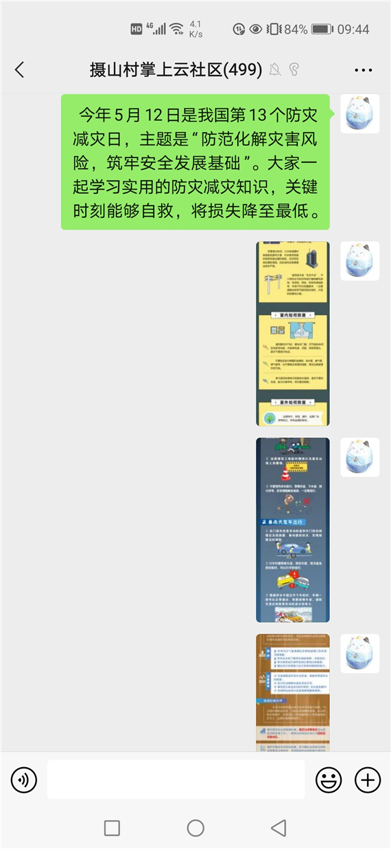 活動(dòng)中,攝山村充分利用好“掌上云社區(qū)”平臺(tái),推送關(guān)于暴雨天安全出行、面對(duì)山洪如何防范自救等應(yīng)急知識(shí)宣傳畫,以群眾喜聞樂見的方式,全方位、多角度地做好防災(zāi)減災(zāi)的宣傳工作。開展了一場(chǎng)閱讀分享會(huì),號(hào)召村民及殘疾人閱讀有關(guān)防災(zāi)減災(zāi)的科普書籍,講解關(guān)于防災(zāi)減災(zāi)知識(shí)和防護(hù)自救等內(nèi)容,普及地震避震、災(zāi)害應(yīng)急避險(xiǎn)等防災(zāi)減災(zāi)的應(yīng)急自救措施,有效將防災(zāi)救護(hù)知識(shí)傳遞到村民手中,使防震減災(zāi)的觀念深入人心。