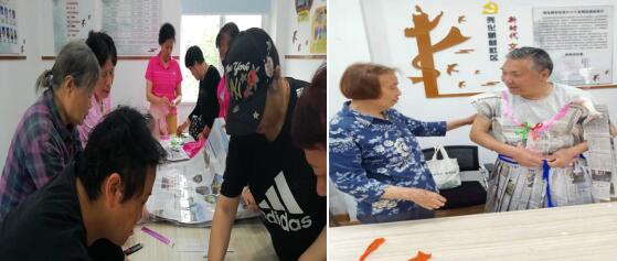 活動(dòng)開始,居民們就紛紛自己動(dòng)手,大家集思廣益、發(fā)揮想象力,對(duì)日常生活中的常見廢舊報(bào)紙、垃圾袋、包裝繩等垃圾進(jìn)行創(chuàng)新再利用,不一會(huì),各式各樣的服裝就做好了,乳腺癌康復(fù)期的蔣阿姨穿著用舊報(bào)紙做的連衣裙第一個(gè)亮相,踩著自信的步伐走上舞臺(tái),還有王叔叔穿著愛人親自做的斗篷帽子也亮相舞臺(tái)中間,張阿姨穿著廢棄塑料布做成的圍裙很隨意的走上臺(tái),雙手叉腰擺起了造型,