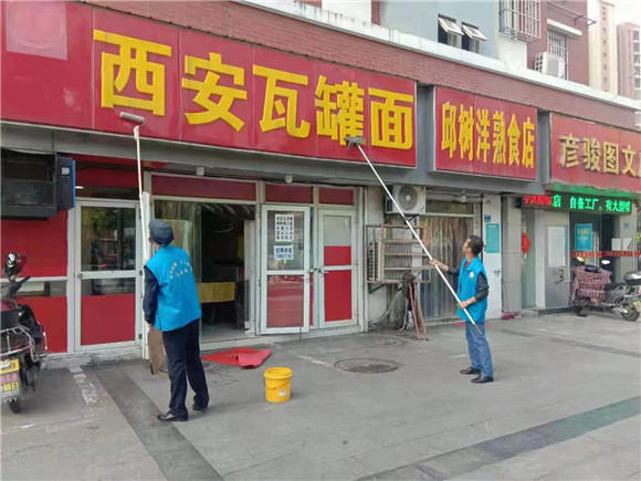 通過提前的安排部署,力爭做到不漏一戶商戶不差一塊招牌。清洗現(xiàn)場,志愿者們拿著水槍和長桿拖把,仔仔細(xì)細(xì)地清洗著所有的門頭招牌,經(jīng)過水槍的沖洗,所有的招牌都煥然一新。在對商戶門頭進(jìn)行大清洗時,志愿者也積極動員沿街商戶對各自“門前三包”區(qū)域進(jìn)行清掃、除塵,整理堆放雜物,讓臨街道路更加干凈整潔。