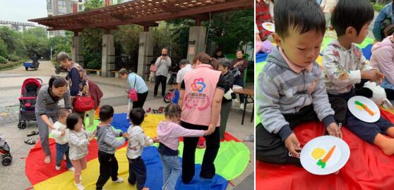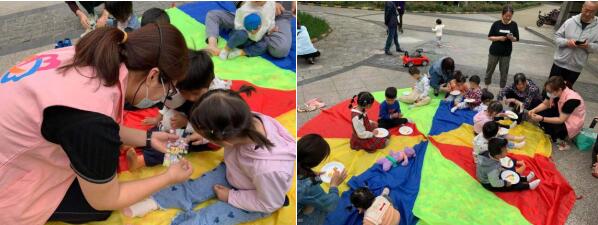 在戶外開展親子活動(dòng)需要?jiǎng)屿o結(jié)合,在舞蹈環(huán)節(jié)結(jié)束后,老師讓孩子們?cè)刈拢o孩子們讀起了繪本《早餐,你喜歡吃什么?》。沉浸在故事的海洋里,孩子們隨著老師的話語開始想象豐盛的早餐,柳老師拿出了紙盤子和橡皮泥,孩子們用彩色的橡皮泥在紙盤上制作胡蘿卜、荷包蛋。做好后,孩子們興高采烈地向同伴展示自己的成品,本次兒童讀書會(huì)活動(dòng)也落下了帷幕。
