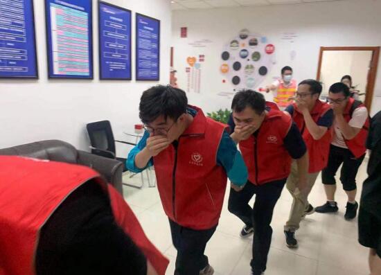 在掌握了基本的理論和實際操作技能后,隨著現(xiàn)場濃煙冒起,演練正式開始,大家聽到引導(dǎo)員的指示后,紛紛拿著濕毛巾捂著口鼻,貓著腰,扶著墻,有序快速地從樓道內(nèi)撤退到空曠的路面,順利完成消防逃生演練。