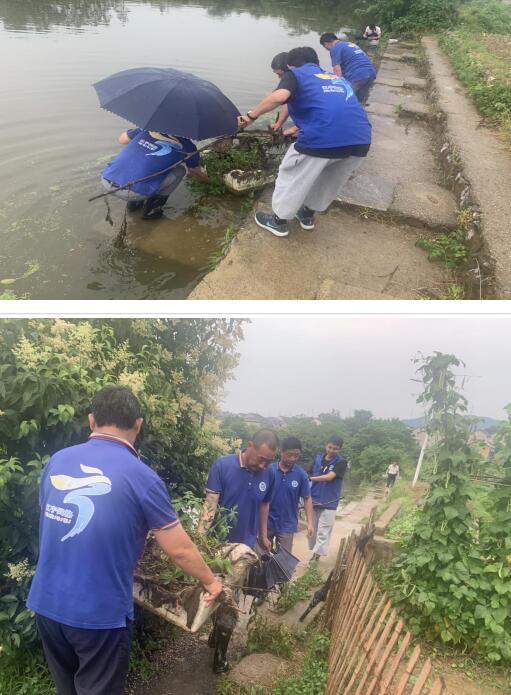 在巡查過程中,網(wǎng)格員們發(fā)現(xiàn)池塘上有被雨水沖擊下來的漂浮物,于是,網(wǎng)格員們立刻來到池塘邊對其進(jìn)行打撈清理并提醒塘邊居民注意安全。