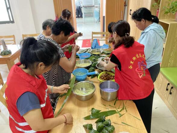 既然是端午節(jié),那粽子自然是必不可少!隨后便進(jìn)入到包粽子環(huán)節(jié)。今年的粽子可不是那么簡單的,社工為大家準(zhǔn)備了提前用紫甘藍(lán)、菠菜、莧菜等多種蔬菜汁浸泡好的彩色糯米,制成獨(dú)具特色的彩色粽子?;顒蝇F(xiàn)場,大家有說有笑地圍在一起,拿粽葉、舀糯米、放蜜棗、包裹、捆扎,其樂融融。參加活動的的戴阿姨說:“端午節(jié)的時(shí)候包粽子、吃粽子,一直是我們中國的傳統(tǒng)習(xí)俗,今天的活動不僅讓我們感受到了濃濃的傳統(tǒng)文化氛圍,而且也使大家在互幫互助的包粽子過程中增進(jìn)了感情,拉近了彼此間的距離,這樣的活動既有意思又有意義。”