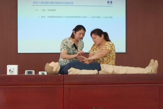 紙上得來終覺淺,在培訓(xùn)的最后,老師教家屬們上臺(tái)實(shí)際演練護(hù)理和急救的簡單方法。此次參加學(xué)習(xí)的學(xué)員中,有一位叫孟枝平的居民表現(xiàn)突出,她是一名肢體三級(jí)殘疾人,雖然腿腳不方便,但堅(jiān)持報(bào)名培訓(xùn)。“我在會(huì)上學(xué)到了很多救人的辦法”,她向大家展示了遇到老人突發(fā)心梗的CPR急救方法,還有食物梗阻時(shí)的救助動(dòng)作。“搶黃金四秒,也許用不上,但這個(gè)技能一定要會(huì),”她積極上臺(tái)操作,配合老師教學(xué),學(xué)習(xí)進(jìn)步很快。