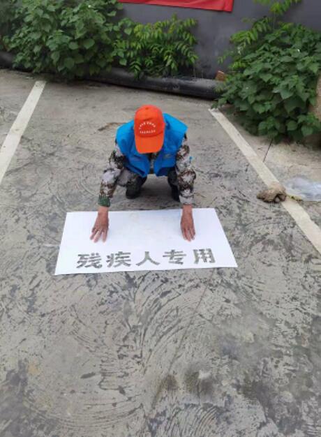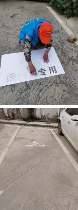 現場,城市治理志愿者們,認真仔細的進行比對后,然后照著模板,畫出殘疾人專屬停車位的字樣,同時為了方便殘疾人出行,志愿者精心挑選了距離社區(qū)入口較近的區(qū)域,共劃出了三處專屬停車位。