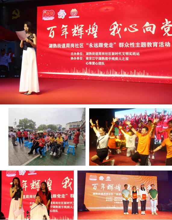 6月26日晚,由湖熟街道周崗社區(qū)新時(shí)代文明實(shí)踐站、心緣愛心團(tuán)隊(duì)及湖熟街道君子殘疾人之家聯(lián)合主辦,以百年輝煌 我心向黨——“永遠(yuǎn)跟黨走”群眾性教育活動為主題的活動,在周崗社區(qū)黨群服務(wù)中心隆重開展。原江寧區(qū)民政局局長 江寧區(qū)善總會副會長 畢書宏、江寧區(qū)慈善總會 副秘書長 陶象銀、江寧區(qū)殘聯(lián)(兼職)副理事長 陳沛然、湖熟街道辦事處副主任 趙宏國、湖熟街道殘聯(lián)理事長李紅梅、周崗社區(qū)黨總支書記 陳武、周崗社區(qū)黨總支副書記 楊平等領(lǐng)導(dǎo)出席。現(xiàn)場特邀央視開門大吉簽約歌手-劉德華電影御用替身演員 歌手教海嘩、星光大道冠軍劉奕辰 等明星現(xiàn)場助陣??箲?zhàn)老兵、70年黨齡的優(yōu)秀老黨員、殘疾人家屬、扶殘助殘企業(yè)代表、愛心人士、社區(qū)居民及志愿者等幾百人冒雨堅(jiān)持參加完全場活動。同時(shí),周崗派出所、湖熟交警中隊(duì)、周崗社區(qū)衛(wèi)生服務(wù)中心、湖熟電力公司的工作人員也挺立在雨中,保證每一個(gè)活動參與者的人身安全,為活動的順利開展保駕護(hù)航。