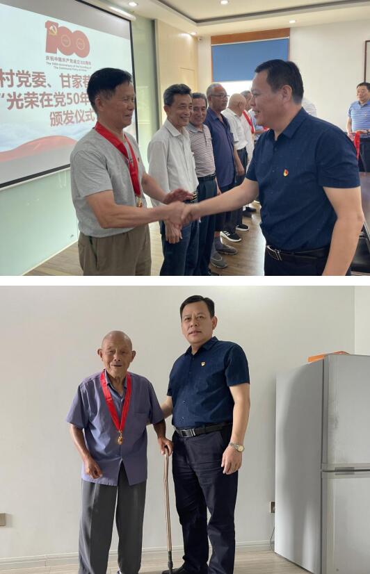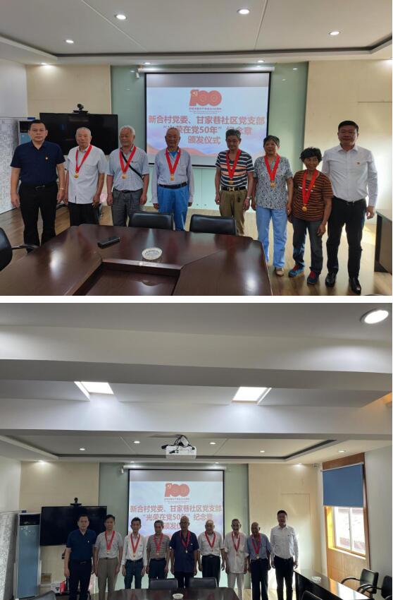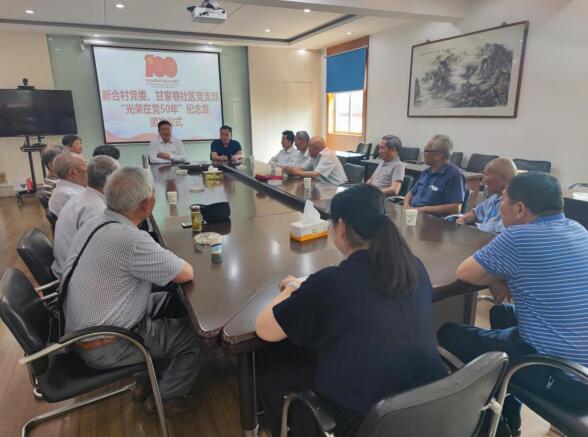 6月30日新合村村委會會議室,新合村黨委、甘家巷社區(qū)黨支部舉辦頒發(fā)“光榮在黨50年”紀(jì)念獎?wù)聝x式暨老黨員座談會。和在場的14位老黨員聚在一起,暢談回憶50年前的入黨初心,追憶奮斗歲月,感悟幸福時刻。隨后,新合村黨委高書記、甘家巷社區(qū)黨支部屠書記給14位老黨員頒發(fā)了“光榮在黨50年”紀(jì)念章,金光閃閃的紀(jì)念章掛在胸前,老黨員們滿懷自豪。