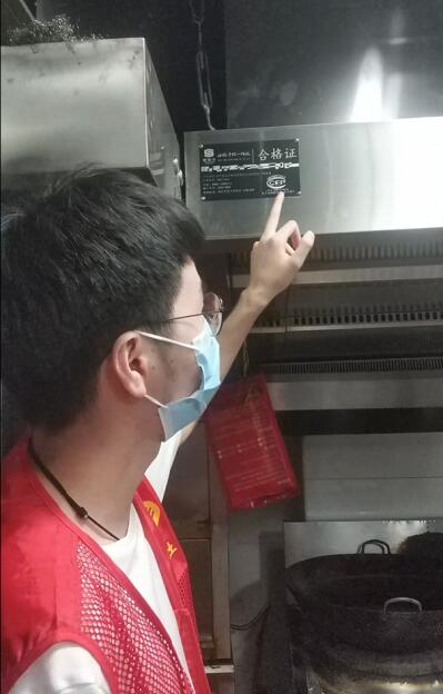 夏季高溫,餐飲店油煙排放問題增多。南京市棲霞區(qū)馬群街道蛇盤社區(qū)走訪轄區(qū)內(nèi)重點(diǎn)餐飲店珍筷大食堂,巡查新設(shè)備的使用情況。