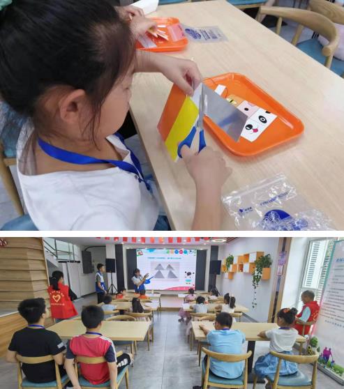 一張擁有不同動物部位的彩紙,如何把它們變成一個完整的動物呢?科普活動現(xiàn)場,橋頭社區(qū)的工作人員引導著孩子們進行著思考。作為這次“小魔盒”制作成功的關鍵條件,光的折射是必須要掌握的知識。從不同的圖片、日常生活示例入手,工作人員將其中原理介紹給小朋友們,讓他們能從身邊事思考其中隱藏的知識。從卡片剪裁到內(nèi)盒與外盒的拼接,再到最終成像,在工作人員的耐心講解下,小朋友們最終成功將分散的部分拼成了一個個可愛的動物頭像。