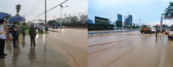 之后,社區(qū)工作人員又發(fā)現(xiàn)紅楓片區(qū)保障房錢道路大面積淹水,針對這一情況,社區(qū)工作人員到達現(xiàn)場,并立刻聯(lián)系市政管理處等相關部門,經(jīng)過多方協(xié)調(diào),安排3輛裝載機到達現(xiàn)場,對路面積水進行全面清理。同時為加速清理積水,社區(qū)工作人員穿著雨衣,打開窨井蓋,經(jīng)過2個小時的奮戰(zhàn),成功將路面積水基本排空,道路交通恢復暢通。