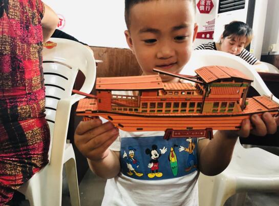 木質(zhì)船板散發(fā)著淡淡木香,古樸莊重,一看就是縮小版的“南湖紅船”。 “紅船精神”既是一種信仰,也是一種精神寄托。接下來的手工制作環(huán)節(jié),孩子們用手工造船的方式回顧黨的百年奮斗史,汲取黨的精神力量。隨后,小朋友們紛紛開始進行手工制作。志愿者耐心指導,孩子們相互合作,拼裝、粘貼……大家以“紅船”為原型,努力將一塊塊“零件”組裝起來,不一會兒一艘艘紅船便呈現(xiàn)在大家面前。