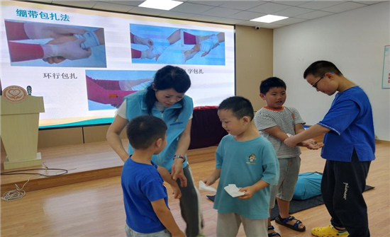 在急救知識培訓環(huán)節(jié),劉老師給大家做了關于“如何撥打120”、“止血包扎”、氣道異物梗阻急救和心肺復蘇術相關知識的培訓。在止血包扎培訓環(huán)節(jié),劉老師請小朋友上前示范,分別扮演救助者和受傷者,悉心指導包扎細節(jié),糾正錯誤。