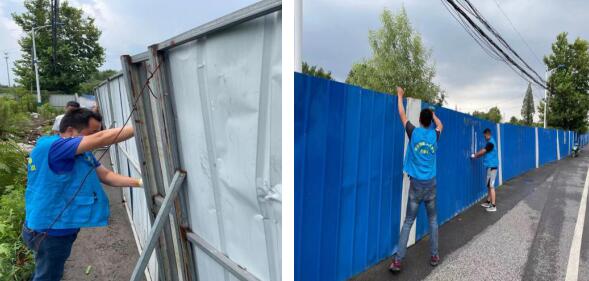 社區(qū)接到電話后,第一時(shí)間組織了城市治理志愿者帶上工具趕赴崗龍路,確定情況屬實(shí)后,志愿者們隨即用電鉆、鉗子、鐵絲等工具將倒伏和破損的圍擋進(jìn)行修繕、固定。因?yàn)樘鞖鈵毫?,大風(fēng)給志愿者們的工作增添了阻力,但他們沒有怨言,認(rèn)真工作,互相配合,通過一個(gè)多小時(shí)的努力,圍擋得到修復(fù),方便了來往行人、車輛的通行,同時(shí)也為他們提供了有效的安全保障。
