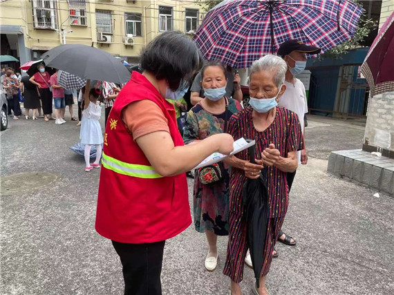 家住堯安新村小區(qū)的陳婷同志是一名退休的黨員干部。在沒(méi)有外墻的老舊車棚里,醫(yī)護(hù)人員在里面做核酸檢測(cè),陳婷就和其他志愿者們?cè)谛^(qū)巡查,勸導(dǎo)居民響應(yīng)號(hào)召,來(lái)做核酸檢測(cè)。烈日炎炎,大家在小區(qū)巡走半圈就汗流浹背,每天工作10多個(gè)小時(shí),志愿者馬甲都能擰出水。