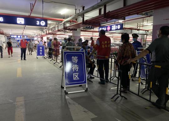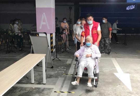 另一邊志愿者也在喊話,清點人數(shù),“十人一組,依次排隊,不要走亂了”引導(dǎo)居民排隊,為了照顧老弱病殘及婦孺,志愿者們還不時走到隊伍盡頭,看看是否有抱著孩子的婦女、腿腳不便的老人及殘疾人需要優(yōu)先安排,發(fā)現(xiàn)腿腳不便的老人和殘疾人,志愿者們第一時間來到他們身邊,攙扶著他們到采樣點。