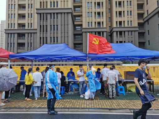 上坊新城檢測點,來的最早走的最遲的黨員儲意平,現(xiàn)場的布置、物資的管理、現(xiàn)場秩序的維持、環(huán)境的消殺等等,到處都能看到他的身影,而他總是精力充沛,跑這邊跑那邊,也總是笑嘻嘻地說:“沒事,我不累。”