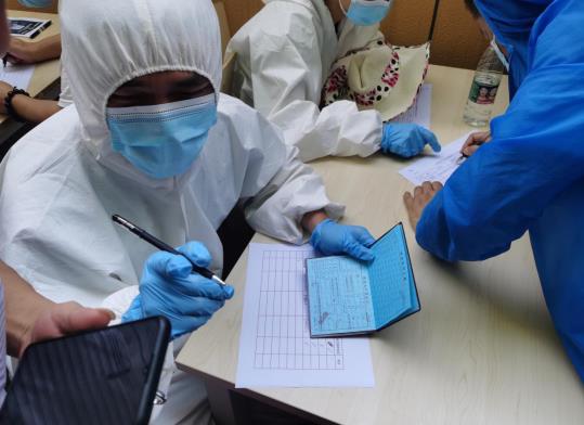 炎炎夏日,他穿著厚厚的防護服、戴著口罩在戶外引導居民有序排隊、登記身份信息,流汗、手套戴的手捂的發(fā)白了,他也不在意,手寫酸了,也只是暫時停下幾秒鐘,緩一緩又投入其中。