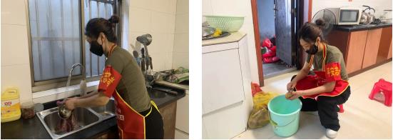 朱儀翠是于益地兒媳婦,疫情期間,她也積極向公公于益地提出,要求主動(dòng)擔(dān)任起“勇躍廚房小幫手”,協(xié)助社區(qū)食堂阿姨給一線工作者準(zhǔn)備餐食,打包飯菜、洗刷碗筷,工作節(jié)奏雖然緊張忙碌,但是一想到可以讓每位志愿者吃上干凈、衛(wèi)生又熱乎的飯菜,她感覺得一切付出都是值得的。