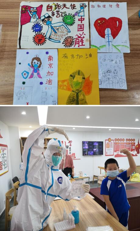 “白衣天使辛苦了!”“致敬逆行者!”……8月13日,在南京市江寧區(qū)湖熟街道徐慕村楊家核酸采集點,周崗小學(xué)的學(xué)生們?yōu)獒t(yī)護(hù)人員送來了自己親手繪畫的作品,表達(dá)對一線工作者的感激與敬佩之情。