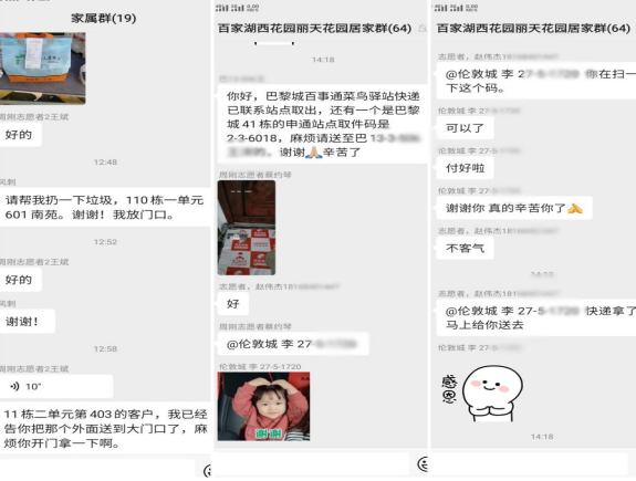 “我有外賣在門口,姓名是......”、“我有快遞到了,能幫忙取一下嘛,取件碼是......”這樣的請求每天都會在居家監(jiān)測的微信群里出現(xiàn)。志愿者們整理好自己管理范圍內(nèi)居民的需求,就開始了一趟又一趟地爬樓送貨。敲一敲門,喊一聲“東西到了”,志愿者這一趟的配送任務(wù)就圓滿完成了,有了志愿者的配送,居民紛紛表示自己的居家觀察生活特別讓人羨慕。