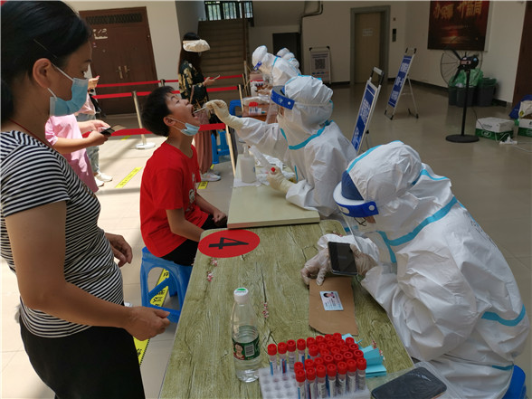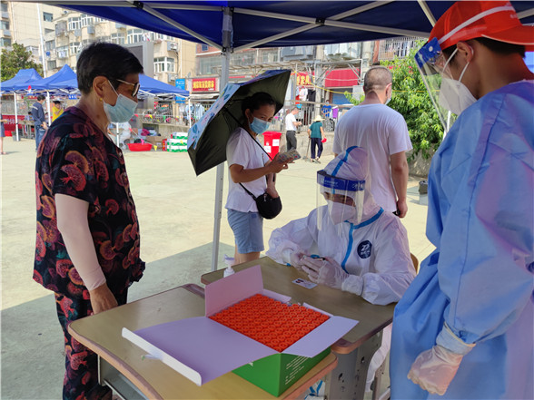 在烈日炙熱的核酸檢測(cè)現(xiàn)場(chǎng),志愿者高文慧、李佳欣、鐘欣雨三人頂著高溫酷暑一直堅(jiān)守在集中檢測(cè)點(diǎn)。錄入居民身份信息、引導(dǎo)居民有序排隊(duì)、協(xié)助解決群眾的疑難困惑……一輪又一輪的核酸檢測(cè)現(xiàn)場(chǎng)都有她們?nèi)说纳碛?。由于整天都需要穿上厚厚的防護(hù)服,加上天氣炎熱,一整天工作下來(lái),她們的衣服都被汗水浸濕。