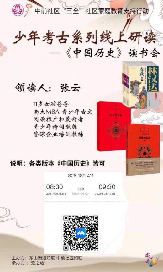 該社區(qū)邀請(qǐng)了南大MBA青少年古文閱讀推廣和愛(ài)好者、青少年詩(shī)詞教練張?jiān)谱鳛樵摶顒?dòng)的領(lǐng)讀人,以微信群聊視頻的方式,向在線的青少年兒童帶來(lái)一期期精彩的歷史故事研讀。