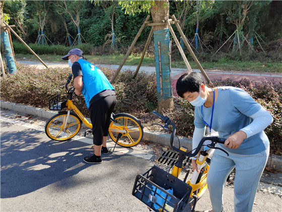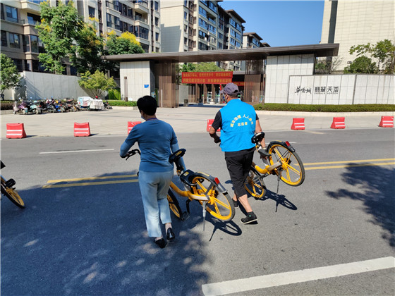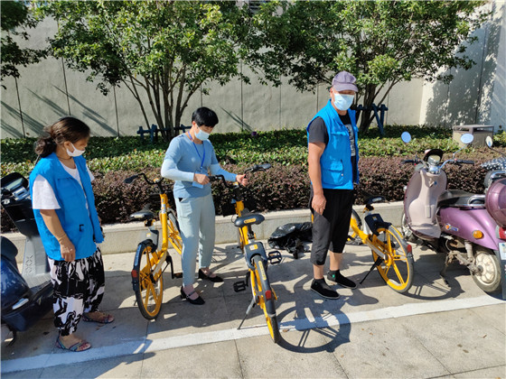在檢查中,發(fā)現(xiàn)有的共享單車被隨意亂堆放草坪中,有的被隨意擺放在人行道上,這樣即占用空間,也不美觀,更容易造成安全隱患。城市治理志愿者對亂停在小區(qū)門口附近的共享單車進(jìn)行清理,整齊地擺放在轄區(qū)內(nèi)指定的停放位上。此次行動總共清理共享單車10余輛。