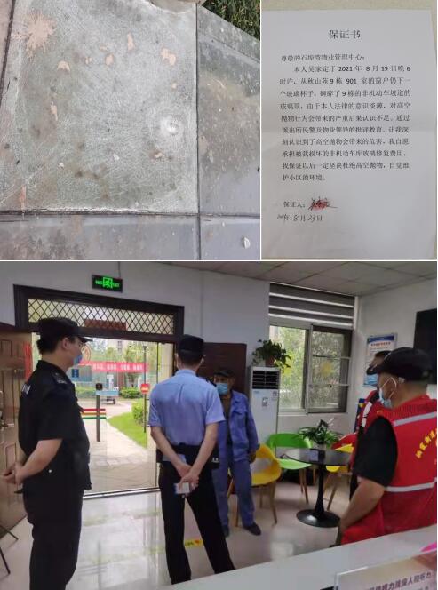 接業(yè)主反映后,石埠灣物業(yè)經(jīng)監(jiān)控查看,確認(rèn)系9樓住戶投擲玻璃杯所致。物業(yè)工作人員及老黨員志愿者協(xié)助民警對(duì)該住戶進(jìn)行思想教育,講解了高空拋物的危害性,情節(jié)嚴(yán)重者會(huì)構(gòu)成刑事犯罪。戶主表示認(rèn)識(shí)到該行為的危害性,并寫下保證書且愿意承擔(dān)相應(yīng)維修費(fèi)用。隨后工程部人員對(duì)坡道頂部玻璃進(jìn)行維修以確保業(yè)主人身財(cái)產(chǎn)安全。