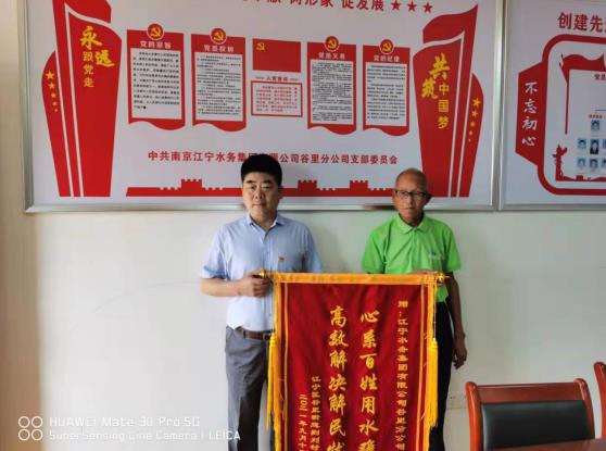 9月15日,南京市江寧區(qū)谷里街道荊劉村一名老黨員將一面寫有“心系百姓用水難,高效解決解民憂”的錦旗送到了水務(wù)集團(tuán)谷里分公司總經(jīng)理金海濱那里,真誠(chéng)感謝他帶領(lǐng)員工徹底解決荊劉村民的”老大難“。