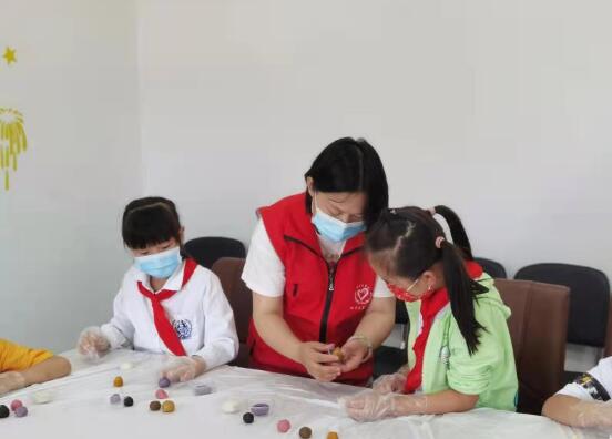 在志愿者一步步的引導(dǎo)幫助講解下,孩子們了解了冰皮月餅的制作流程。大家戴起手套、揉搓糯米團(tuán),稱餡料、包餡、撒糯米粉、上模具,活動現(xiàn)場歡笑陣陣,不一會精美的冰皮月餅就做好了。