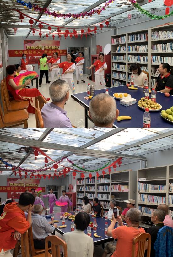 活動現(xiàn)場,退役軍人們圍坐在一起,品美食、看演出。穿上紅裙子、拿起粉扇子……在歡快的音樂伴奏下,志愿者們熱情地跳起舞蹈、唱起歌謠,讓氣氛瞬間達(dá)到高潮。退役軍人們則認(rèn)真地欣賞著志愿者們的表演,還不自覺地跟著音樂哼唱起來。