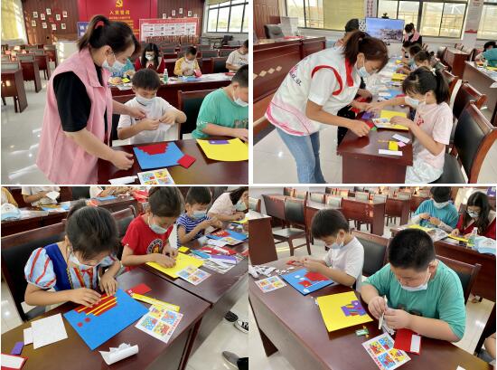 鮮艷的五星紅旗、彩色的多層蛋糕、莊嚴(yán)肅穆的天安門廣場(chǎng)、展翅飛翔的和平鴿……孩子們親自動(dòng)手,在工作人員的指導(dǎo)下,在彩紙上貼上一個(gè)個(gè)貼畫(huà),用自己的方式為祖國(guó)母親慶生。