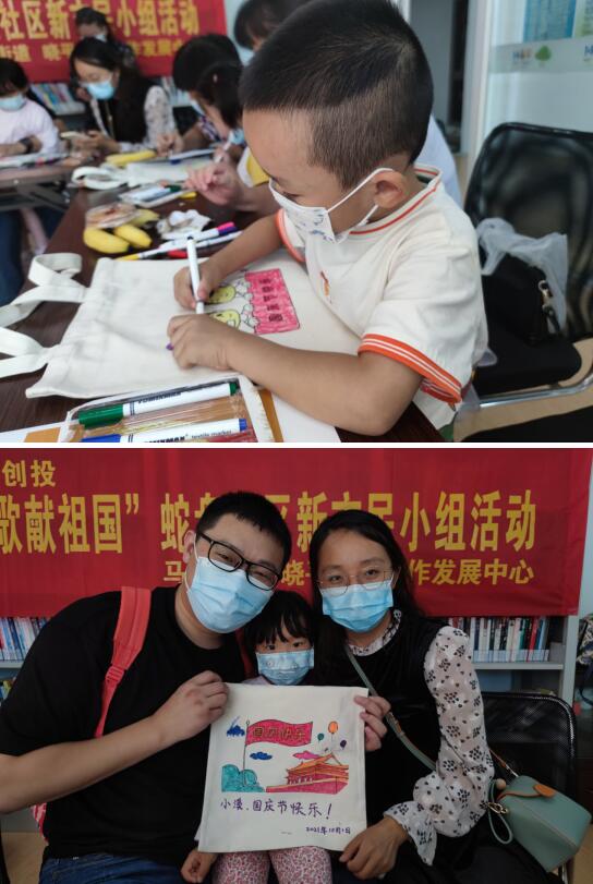 活動(dòng)中,工作人員帶領(lǐng)小朋友們認(rèn)識(shí)國(guó)旗、國(guó)徽的特征,了解我國(guó)國(guó)歌《義勇軍進(jìn)行曲》,大家一同高唱國(guó)歌,祝福祖國(guó)繁榮昌盛。隨后,小朋友們?cè)诩议L(zhǎng)的幫助下,繪制環(huán)保袋,用豐富的色彩和元素表達(dá)對(duì)祖國(guó)的感情。經(jīng)過精心繪制,帆布袋變成一個(gè)個(gè)獨(dú)一無二又可愛的藝術(shù)品。大家紛紛與自己的作品合影留念。