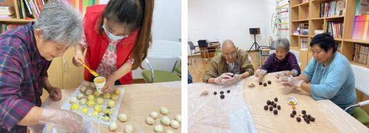 在徐慕敬老院活動現(xiàn)場,烘焙老師為大家準(zhǔn)備了咸鴨蛋、酥皮、豆沙等制作蛋黃酥的原料,并簡單描述了制作步驟。隨后,老師一邊講解,一邊鼓勵大家動手,制作過程循序漸進(jìn),并對操作不便的老人進(jìn)行單獨(dú)指導(dǎo),協(xié)助一同完成。最后將大家制作好的蛋黃酥放進(jìn)烤箱,伴隨著歡聲笑語,香噴噴的蛋黃酥半個小時就出爐了。吃著自己親手做的蛋黃酥,老人們非常自豪,連夸好吃。在活動中不僅鼓勵動手能力強(qiáng)的老人親力親為,也陪同行動不便的老人聊天,增加大家的參與度,提升活動的整體氛圍。